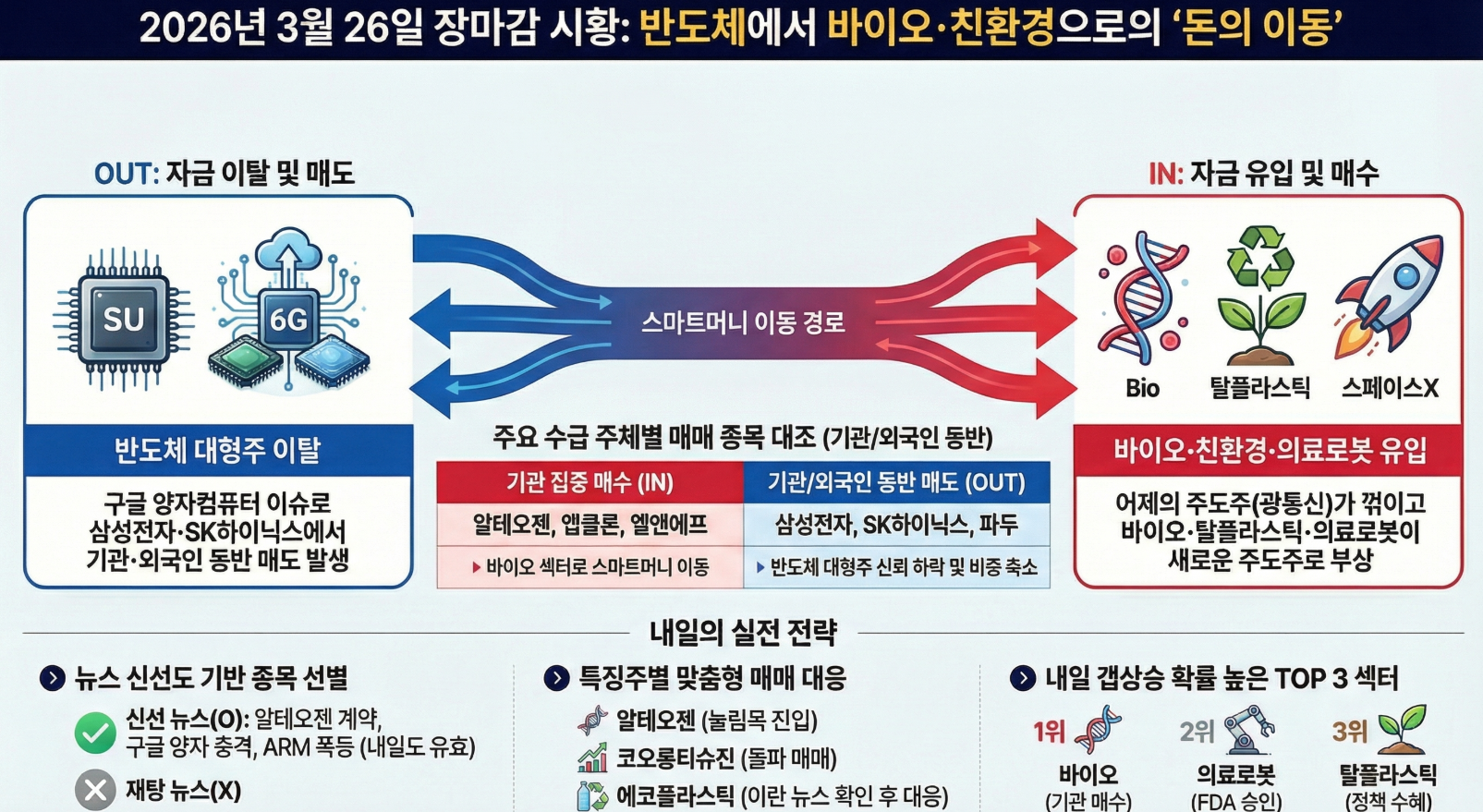 → 하루 만에 주도 섹터가 완전히 교체됐습니다. 이런 빠른 순환매 장세에서는 "어제 강한 종목 추격"이 가장 위험합니다. 오늘 처음 강하게 뜨는 섹터를 일찍 잡는 것이 핵심입니다.