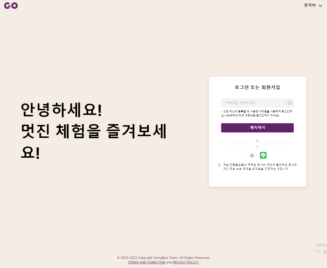 먼저, 고잉버스 웹사이트에 접속해서 회원가입을 해주세요. 이미 계정이 있다면 로그인하면 됩니다.