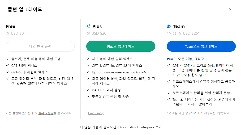 Free = 간단한 질문 답 정도만 가능하고 이미지생성 데이터 업로드를 통한 답변이 불가 합니다. 또한 질문 할 수 있는 횟수가 극히 적어서 몇 번 대화하면 대화가 중단 됩니다. 더욱 중요한건 무료 버전은 고성능 GPT-4 그리고 GPT-4o를 이용하지 못하는게 제일 불편할듯 합니다. (무료버전 사용자는 시간당 약 20개에서 30개의 질문을 할 수 있다고 알려져 있습니다.)